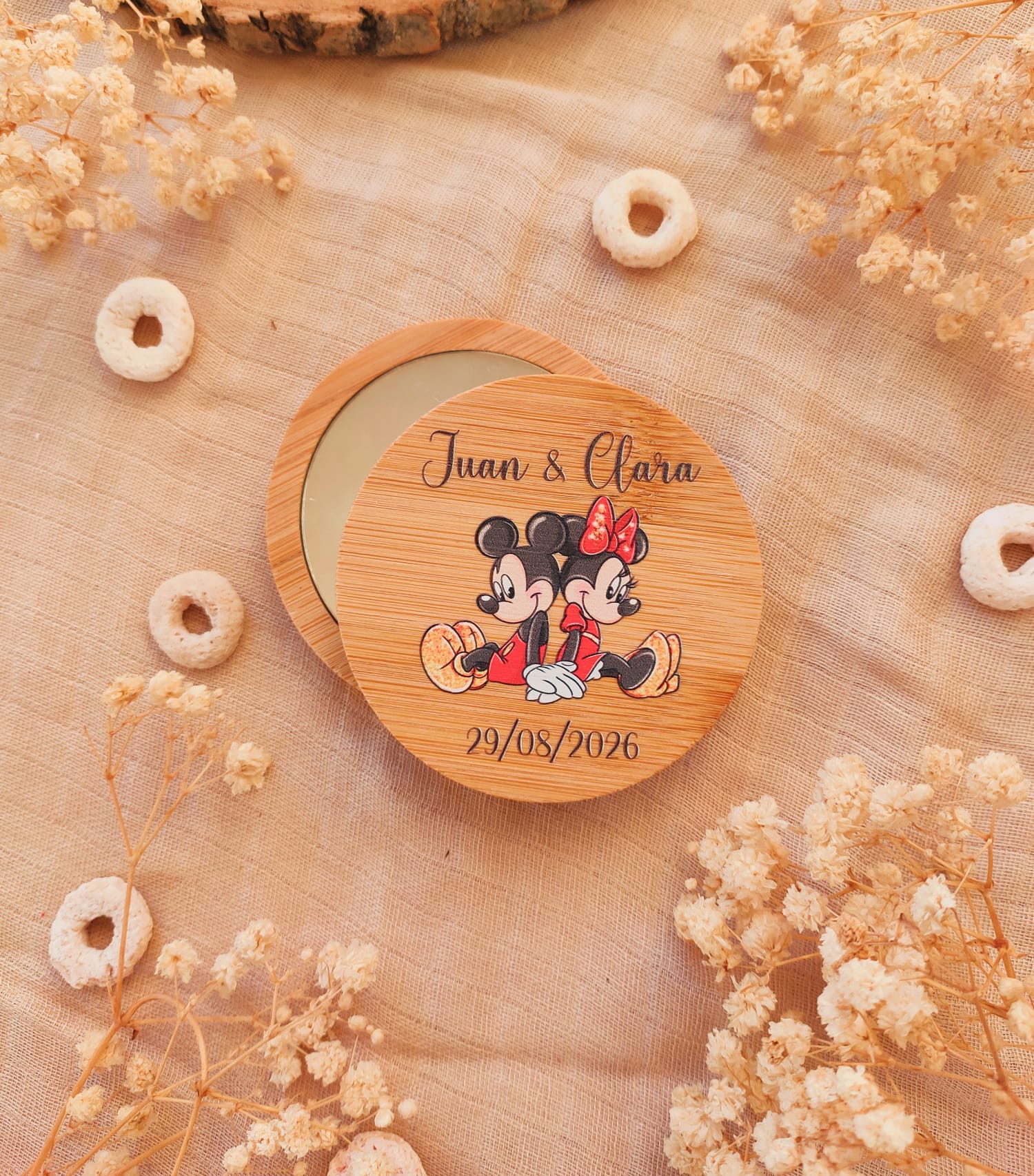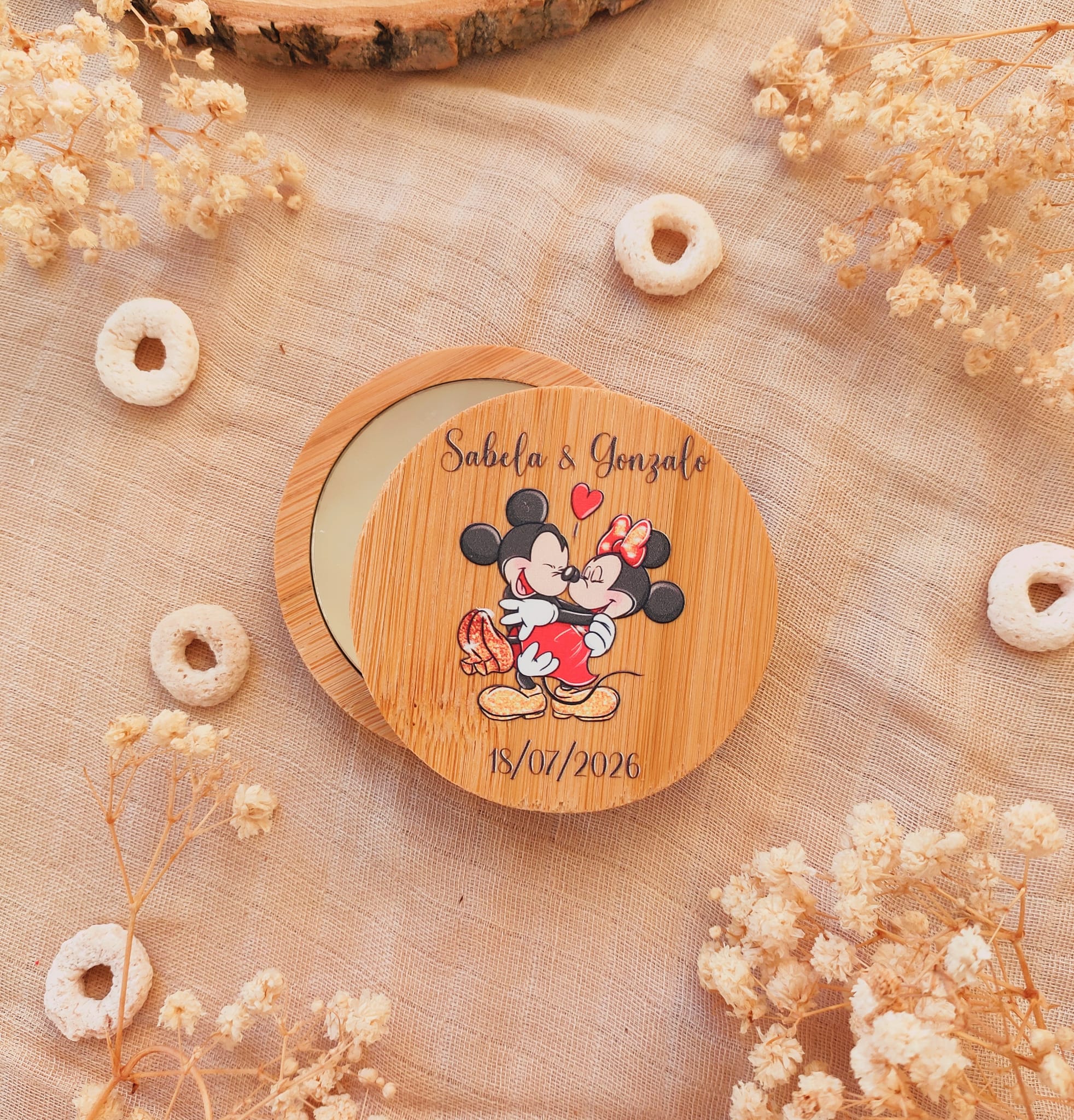 Están fabricados en bambú natural, un material ecológico y ligero, e incluyen un espejo resistente ideal para llevar en el bolso o neceser. Cada pieza se personaliza con vuestros nombres y la fecha del enalce.