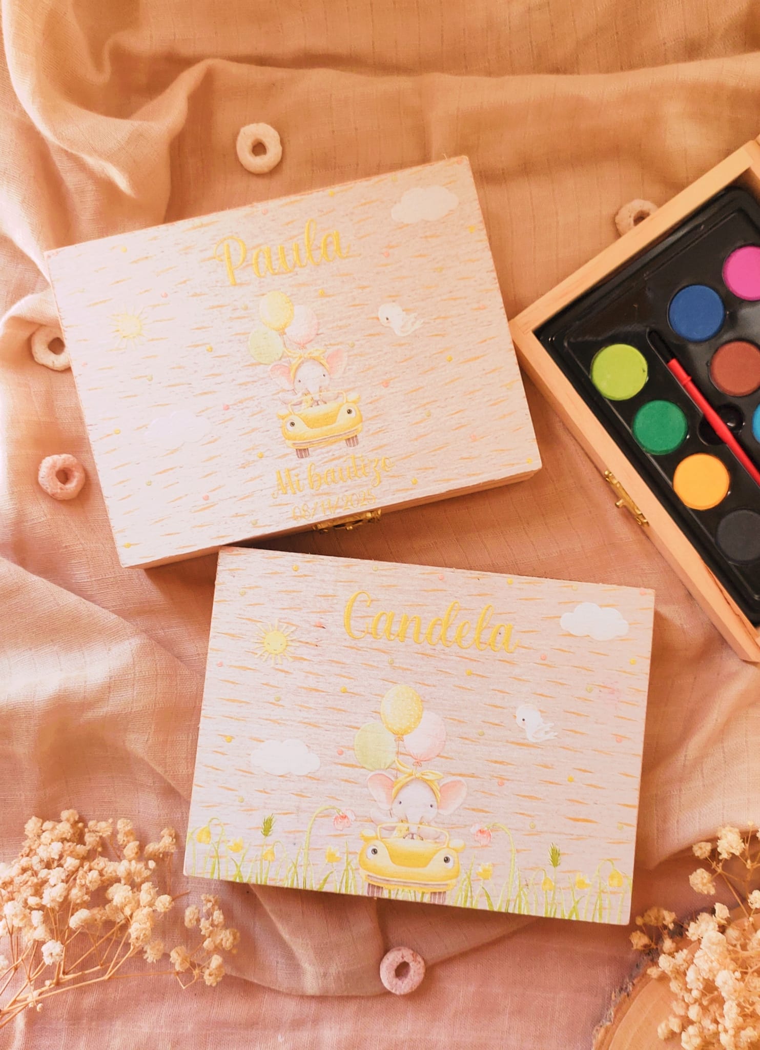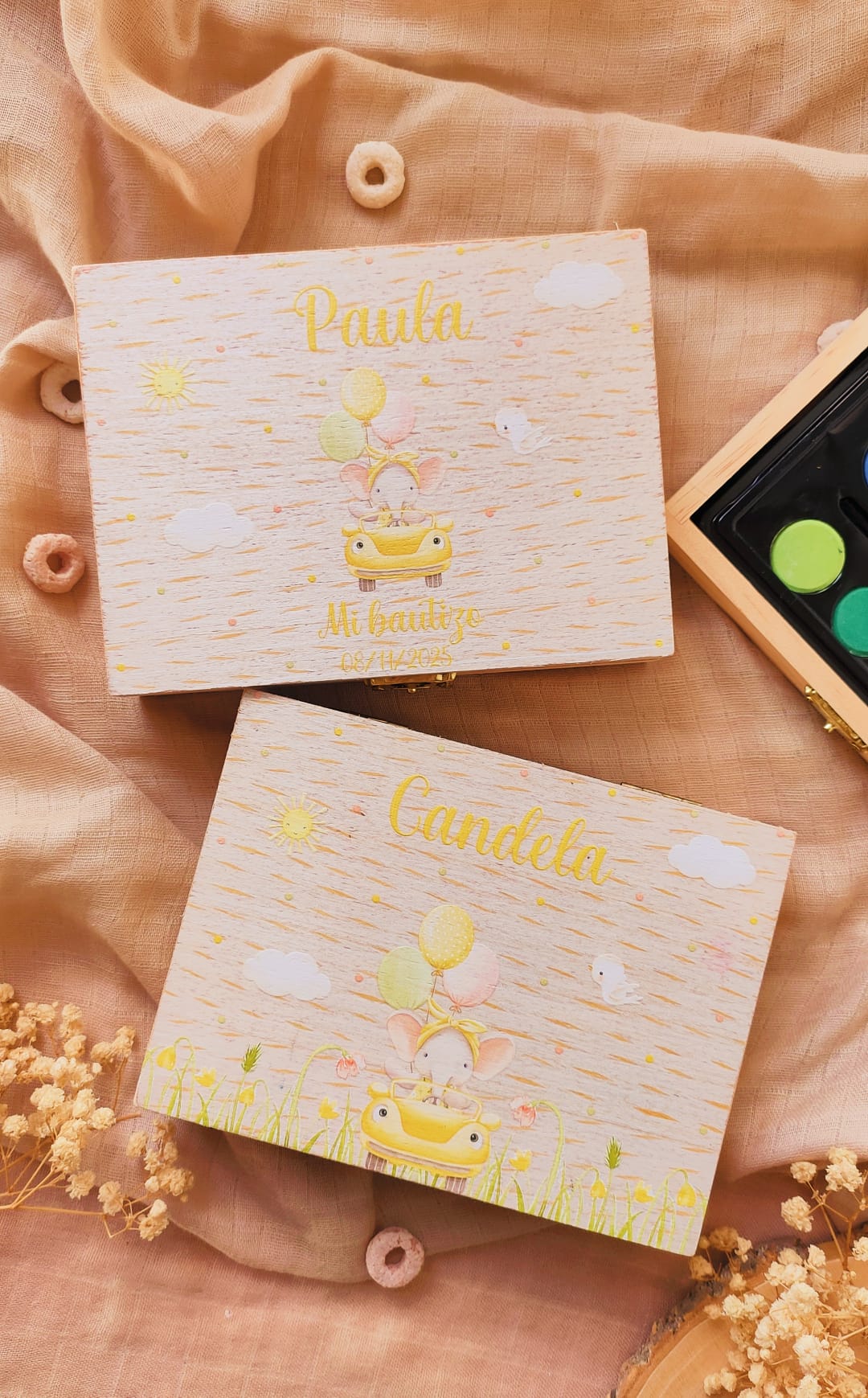 Fabricados en madera natural, con cierre metálico y diseño infantil delicado, son ideales tanto para jugar como para conservar como recuerdo.