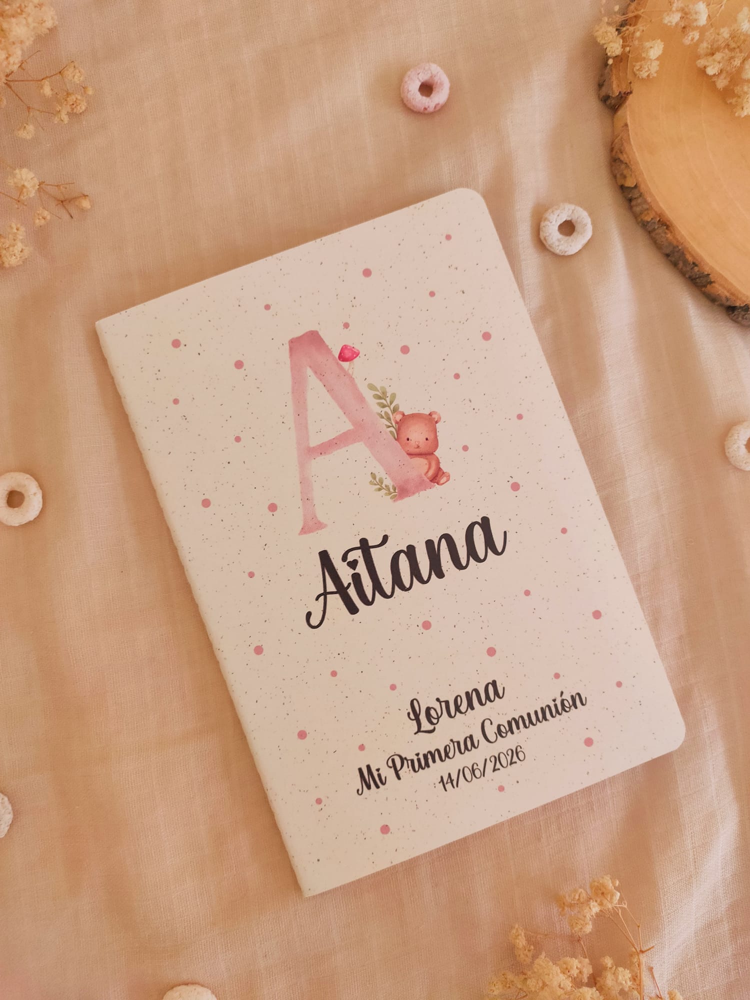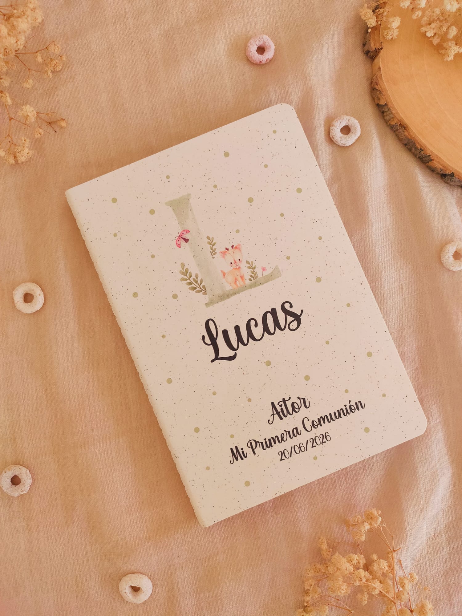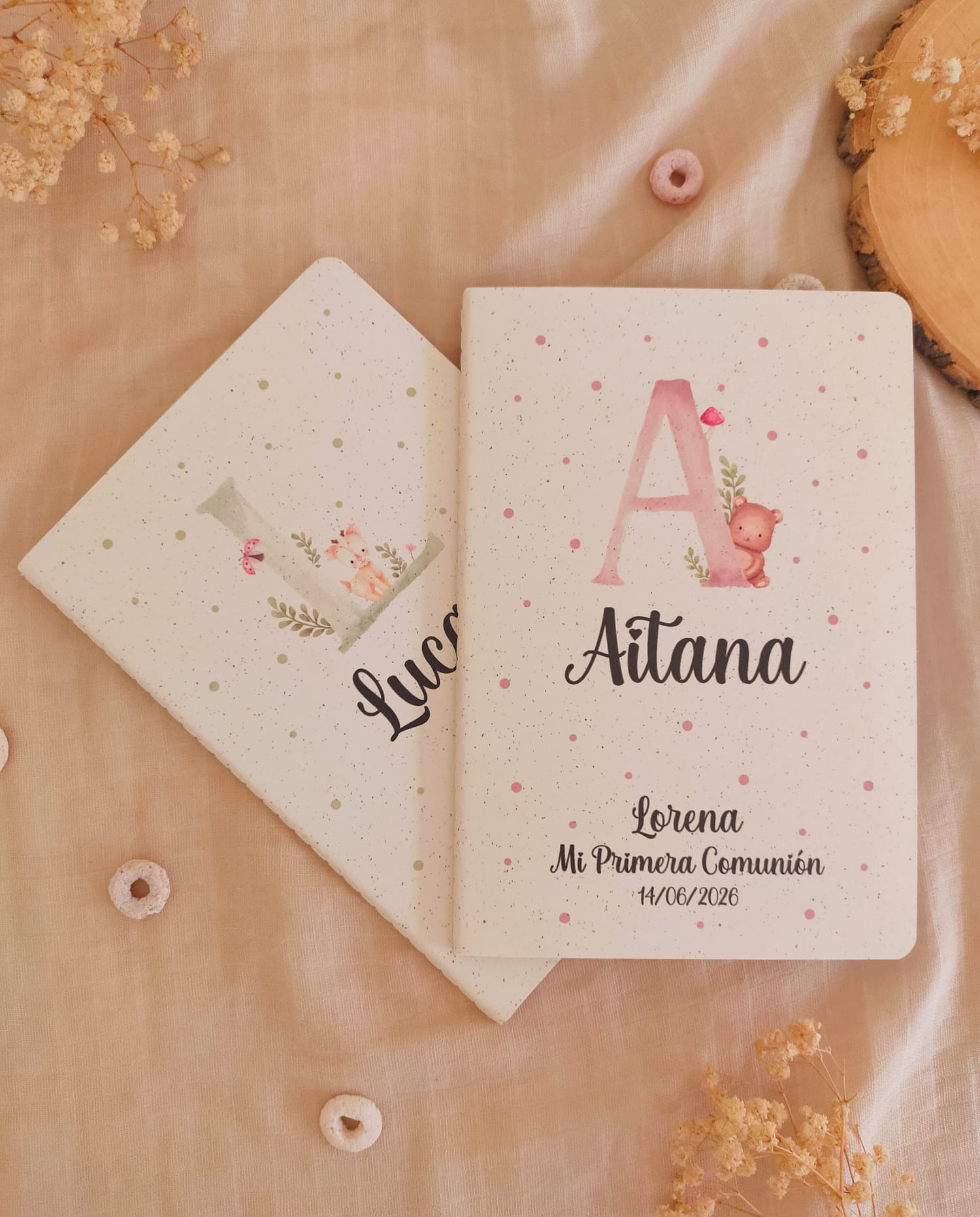 Nuestras libretas son perfectas como detalles de comunión personalizados, bautizos, cumpleaños o bodas. Se personalizan con el nombre del invitado, la fecha, evento y nombre del homenajeado/a. Si lo deseas, también se pueden personalizar solo con el nombre del invitado.