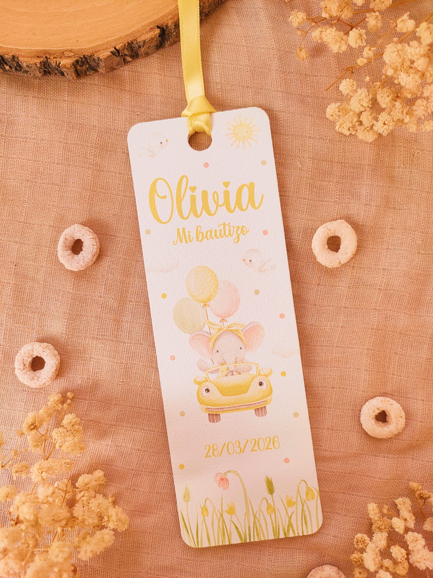 Cada marcapáginas está fabricado en madera y se personaliza con nombre del niño o niña, fecha del evento y texto, acompañado de una ilustración infantil delicada. Incluyen una cinta decorativa, que aporta un toque especial y facilita su uso como punto de libro.
