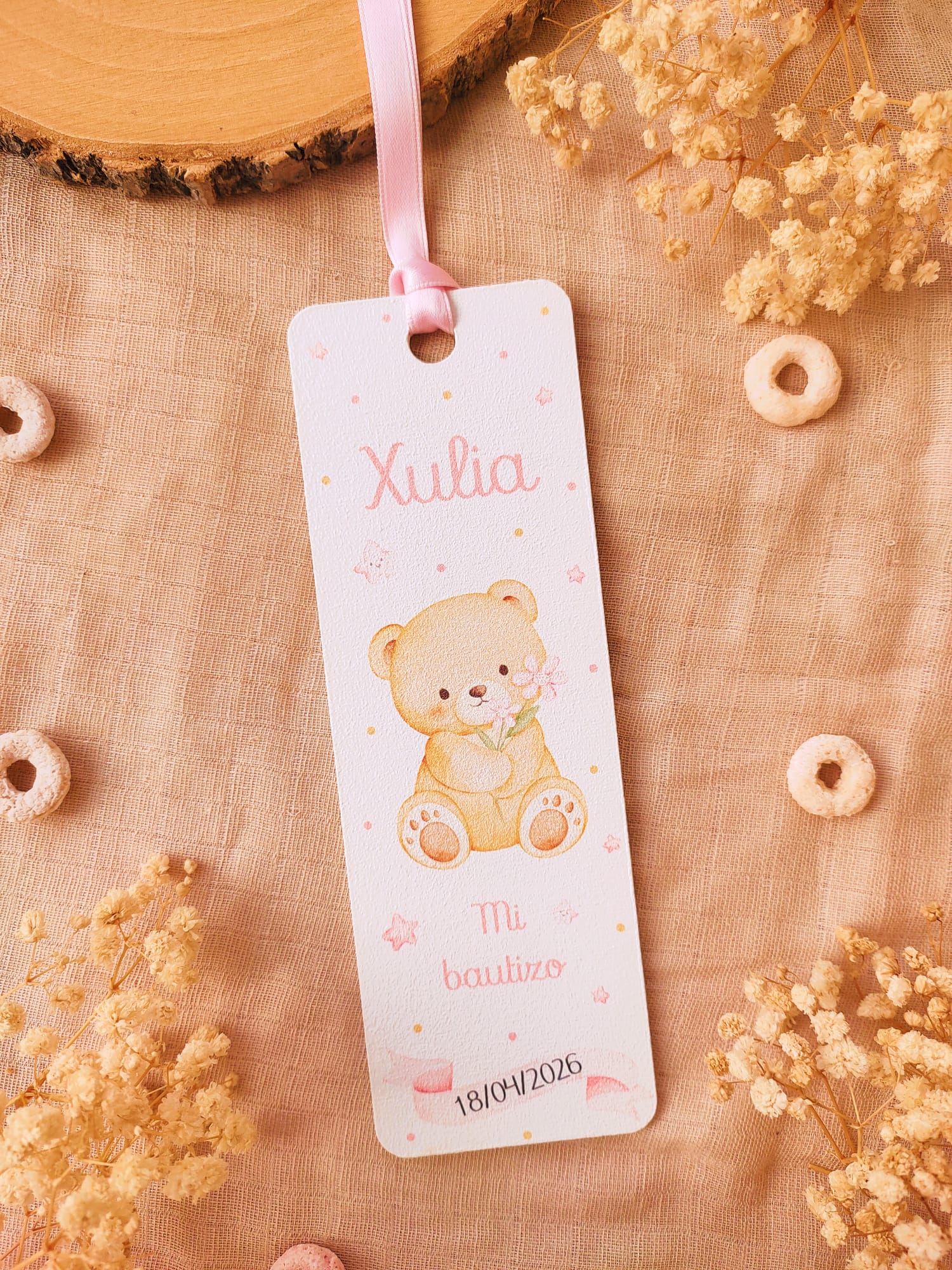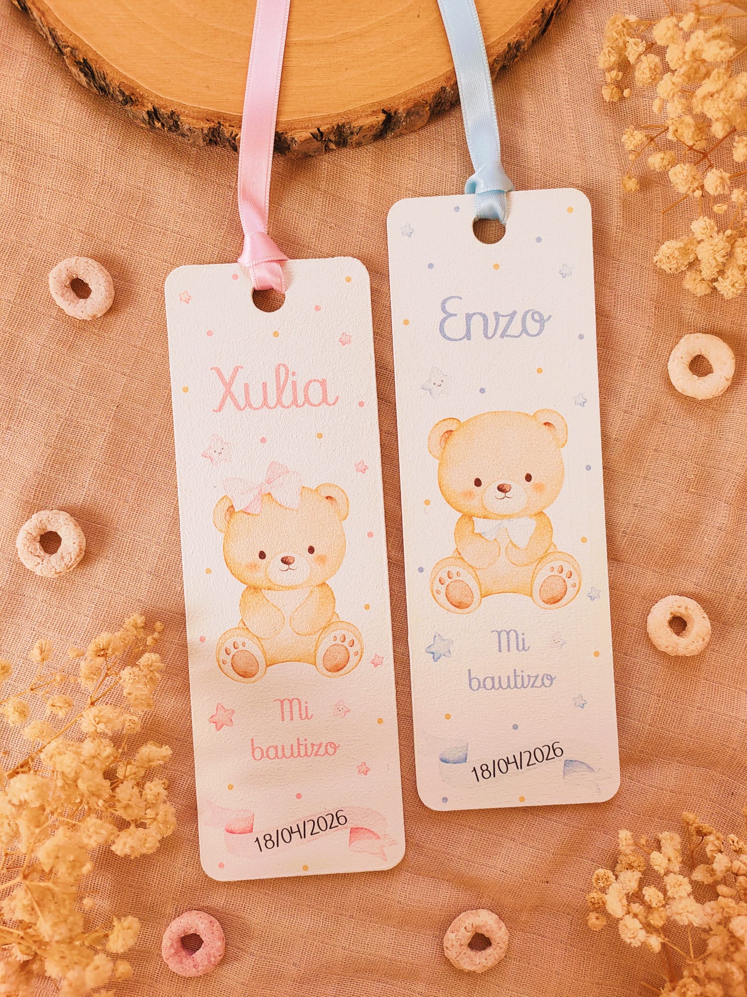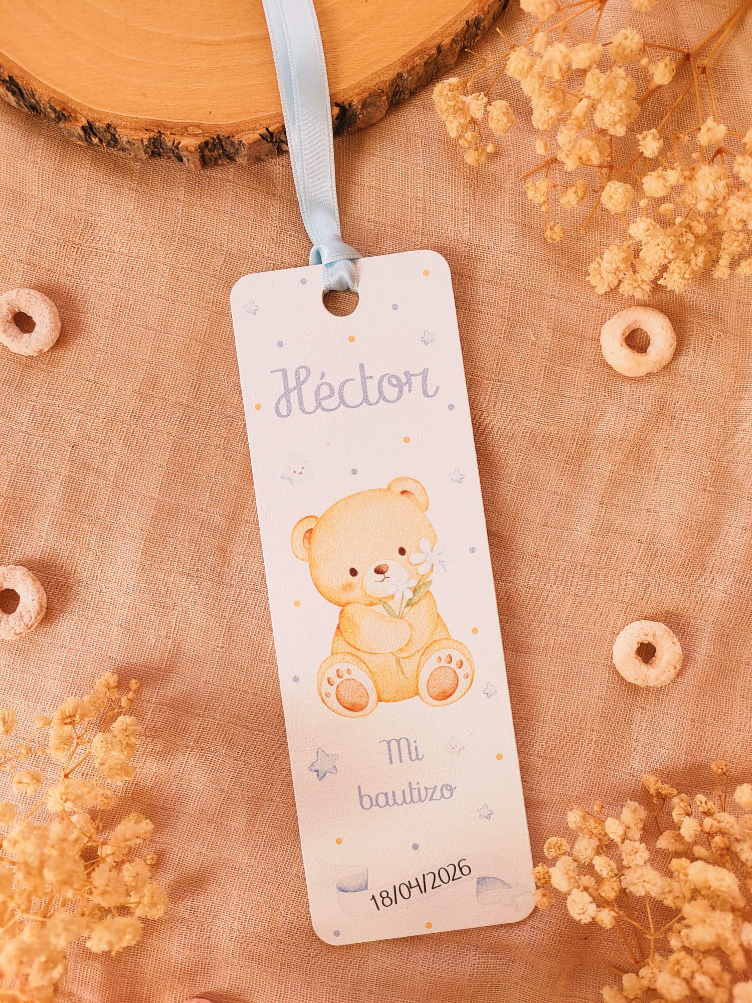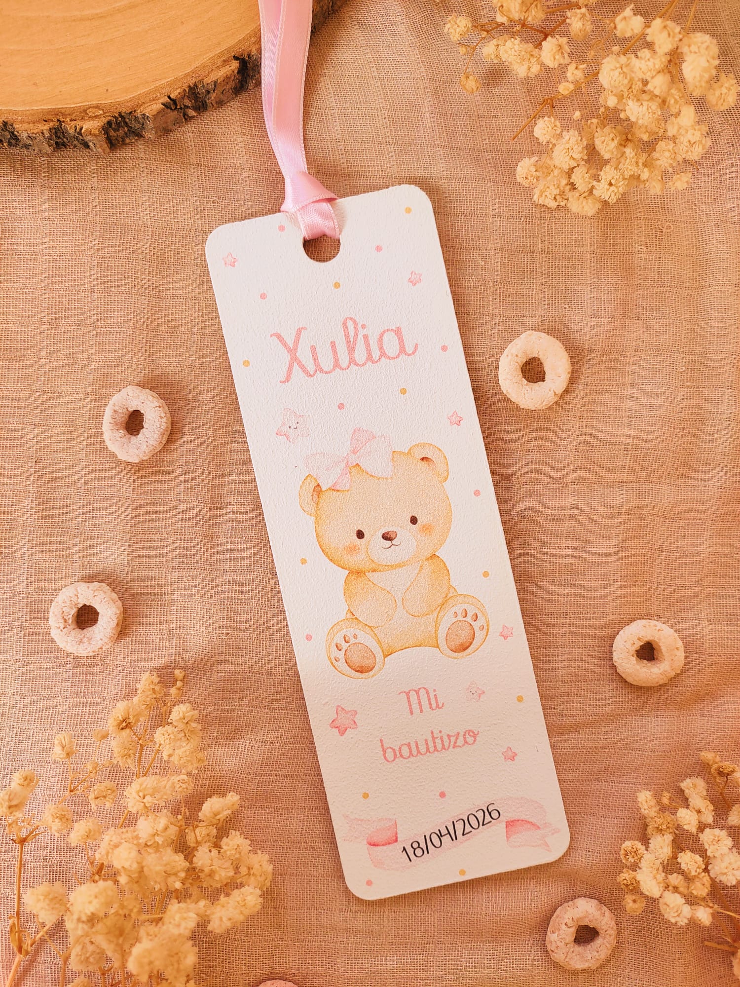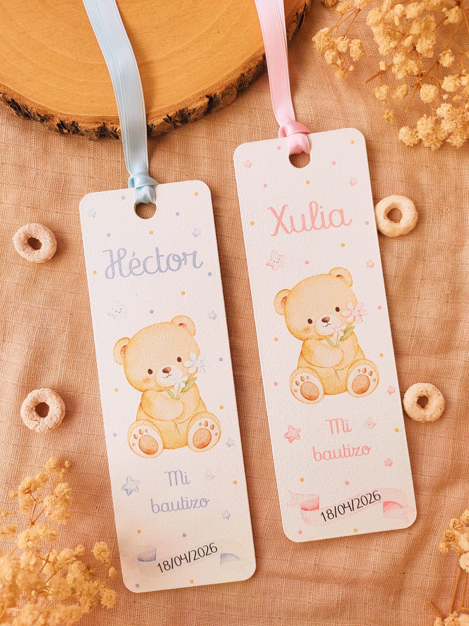 Cada marcapáginas está fabricado en madera y se personaliza con nombre del niño o niña, fecha del evento y texto, acompañado de una ilustración infantil delicada. Incluyen una cinta decorativa, que aporta un toque especial y facilita su uso como punto de libro.