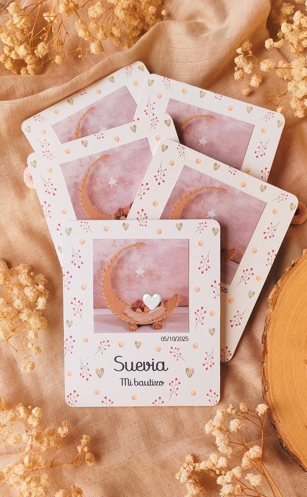 Con unas medidas de 12 cm de alto,10 cm de ancho y 5 mm de grosor. Están pintados a mano y los personalizamos con el nombre del peque,el evento y la fecha.