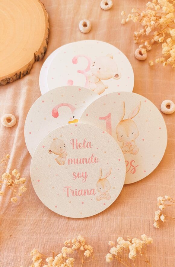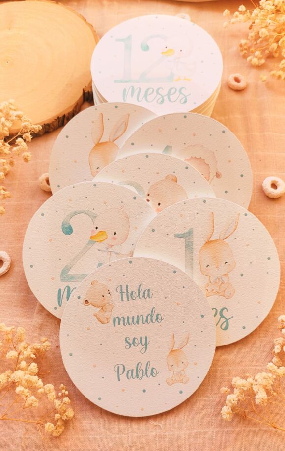 Los discos cumplemes de madera son una bonita manera de fotografiar la evolución de tu bebé mes a mes desde su nacimiento hasta su primer añito. El cumplemes está compuesto por 13 placas: