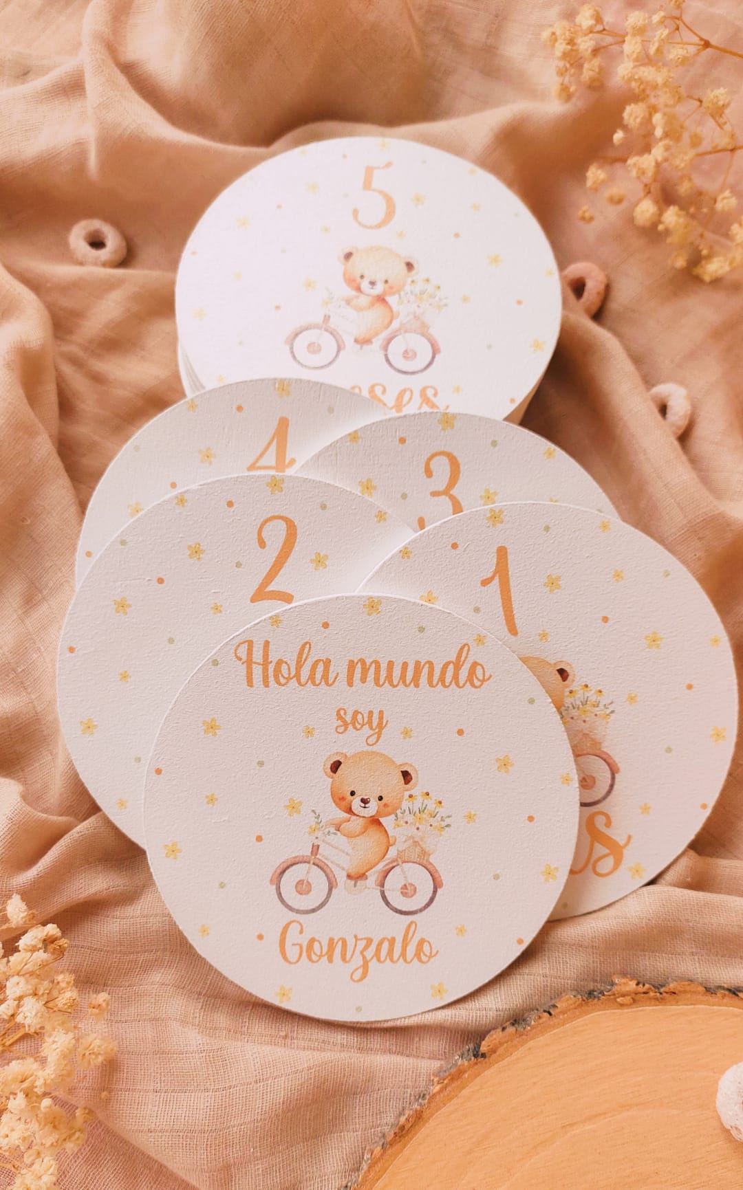 Los discos cumplemes de madera son una bonita manera de fotografiar la evolución de tu bebé mes a mes desde su nacimiento hasta su primer añito. El cumplemes está compuesto por 13 placas: