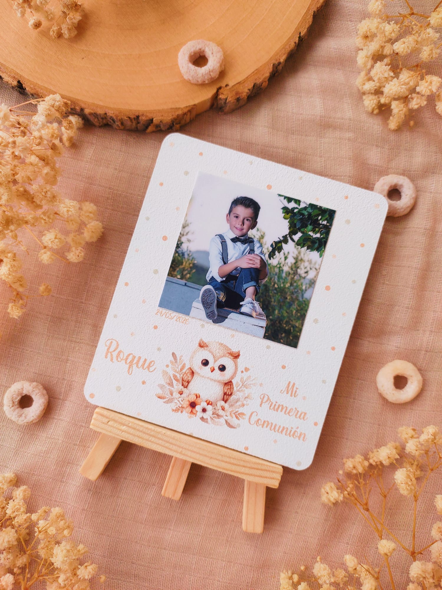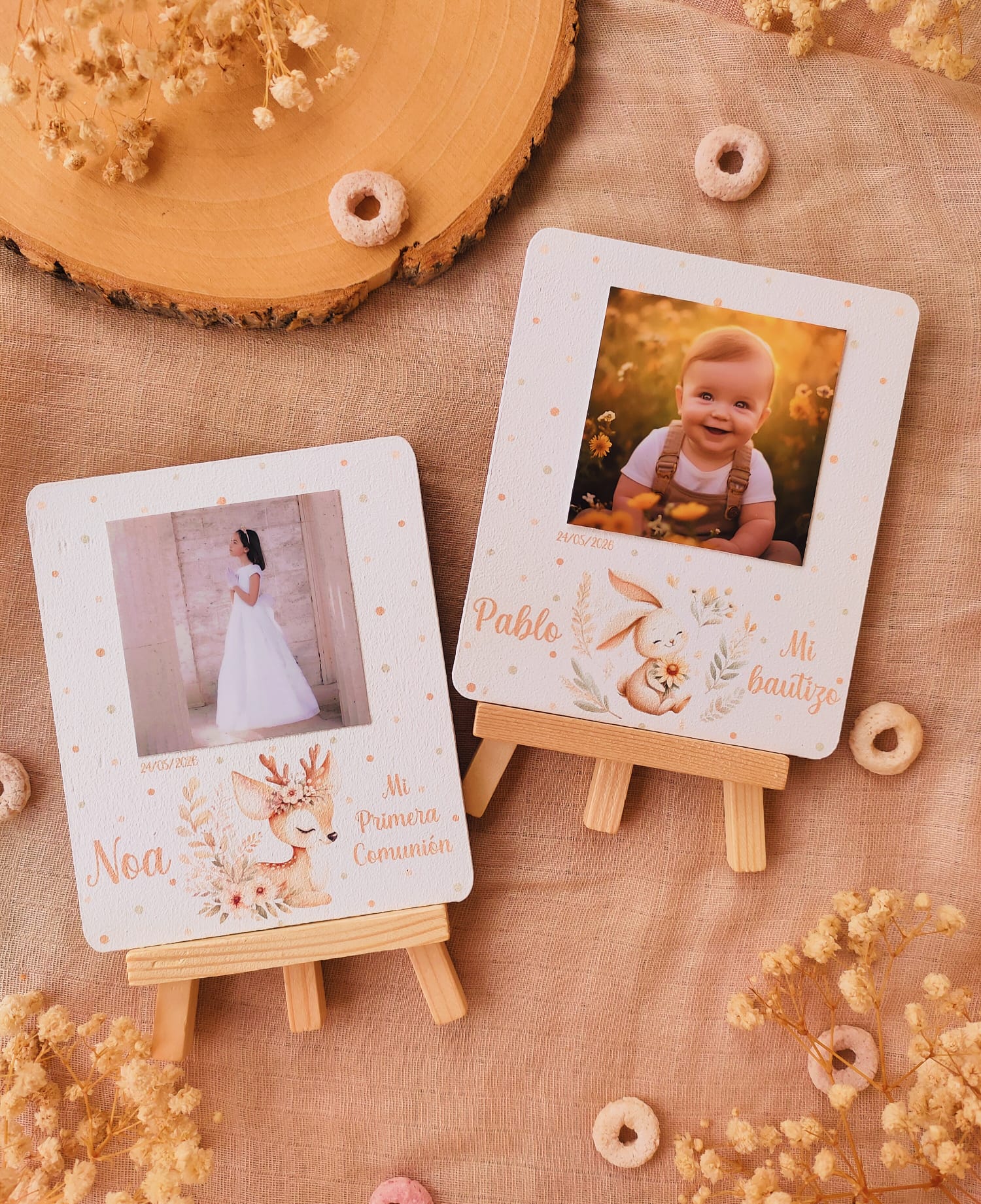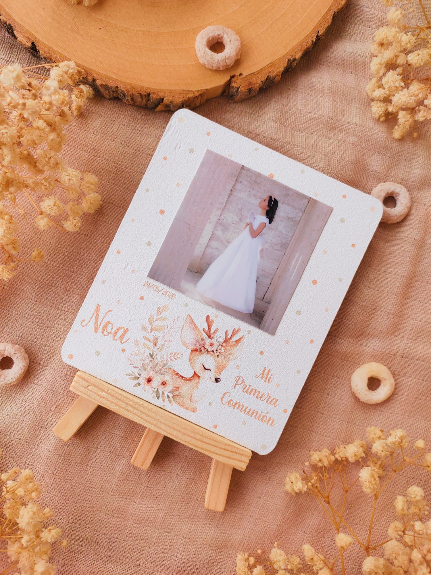 Cada recordatorio se presenta sobre una base de madera con caballete, lo que permite colocarlo fácilmente como elemento decorativo en cualquier rincón del hogar. Incluyen fotografía , nombre del niño o niña, fecha del evento y una dulce ilustración infantil que aporta un toque cálido y emotivo.