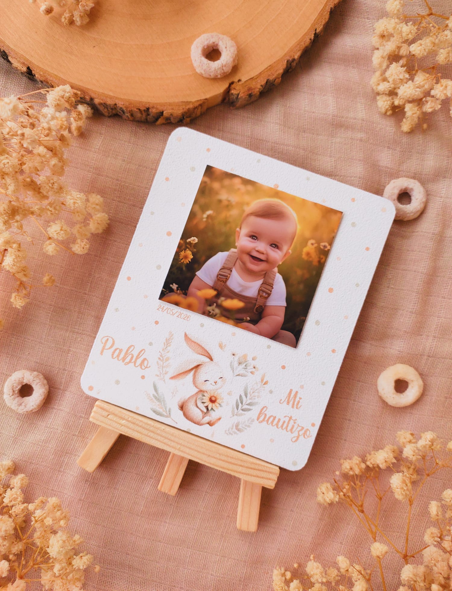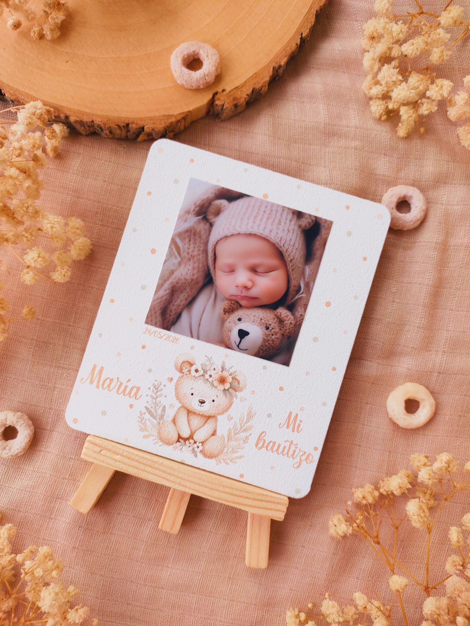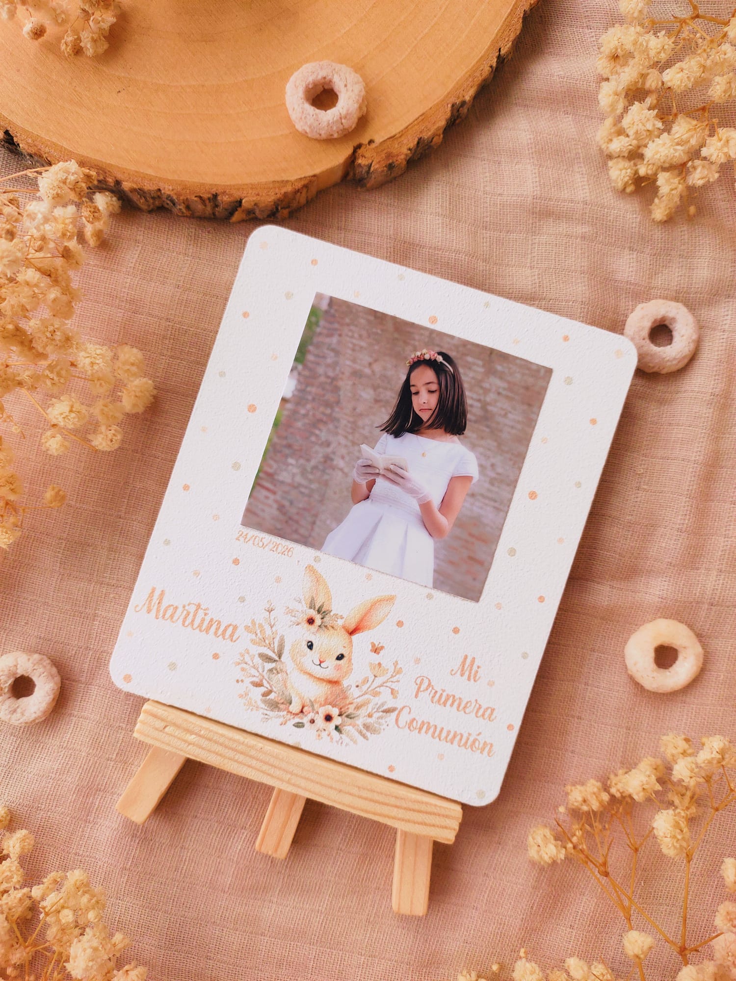 Cada recordatorio se presenta sobre una base de madera con caballete, lo que permite colocarlo fácilmente como elemento decorativo en cualquier rincón del hogar. Incluyen fotografía , nombre del niño o niña, fecha del evento y una dulce ilustración infantil que aporta un toque cálido y emotivo.